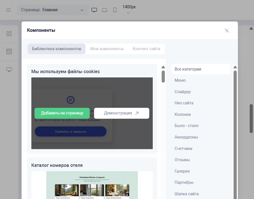Выберите компонент в библиотеке и нажмите кнопку “Добавить на страницу”